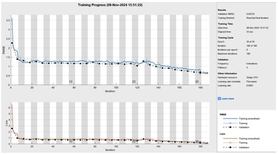 The processing architecture is divided into multiple sub-modules that use different techniques to process data and display the results accordingly. The pre-processing phase includes filters such as data type changes, the placement of unique number patterns in string data, decision-making based on null values, and more. Once all the data are uploaded, they are stored in terms of different variables based on dependencies. The pre-processed data are used in a 4D matrix and are loaded as training and testing data, along with the training and target labels. The collected data are processed through various layers of the CNN, along with the training labels, and the model is then stored in MAT files. These files are database architectures from MATLAB R2018a used to store data in object form for later processing. CNN classification occurs when the model is trained and has stable validation accuracy. The classification process loads the test data from the MAT database and makes predictions using a trained model. After the testing process is complete, the algorithm generates message boxes containing the status of the uploaded sample. The sample is classified into three categories: liver, kidney, and heart. Each category has positive and negative values in terms of Yes and No. The classified data is stored in a vector that is loaded under the recommendation module. The recommendation module uses a fuzzy type-2 model to find similarities and provide recommendations based on the reported parameters of the user’s health. It offers various recommendations based on the calculated probabilities, ranging from no recommendation to a critical situation requiring a doctor’s visit. The CNN model used in this execution performs with 94.2% accuracy, an RMSE (root mean square error) of 0.2057, sensitivity of 96.85, and specificity of 97.43. These parameters determine the model’s performance and demonstrate accuracy when working with different test module sets. In Figure 4, RMSE measures the difference between predicted and actual samples. A lower RMSE indicates higher accuracy.