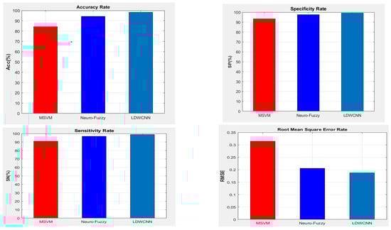 Comparison chart between the MSVM, neuro-fuzzy and LDWCNN models.