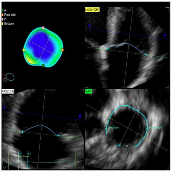Anatomic and Doppler examinations and measurements were performed according to recent American Society of Echocardiography recommendations and European Association of Cardiovascular Imaging (EACVI) guidelines [17,18]. The 2D and 3D echocardiography was performed and included the following parameters: the left ventricular (LV) and left atrial (LA) geometry (diameters and volumes), LV ejection fraction, the RV geometry (RV diameters, areas and volumes), functional (velocity of the tricuspid annular systolic motion (S′), tricuspid annulus plane systolic excursion (TAPSE), RV fractional area change (FAC), RV ejection fraction (RVEF), and strain (RV free wall longitudinal strain (RV FWLS) and RV septal longitudinal strain (RV SLS)), the tricuspid valve 2D (the systolic and diastolic four-chambers diameters), the leaflet tenting height (the distance between the coaptation of the septal and anterior leaflets and the TA plane) and area (the area enclosed by the annular plane and septal and anterior leaflets), and 3D (the systolic and diastolic four-chambers (septal–lateral), two-chambers (anterior–posterior), major axis TA diameters, TA area, perimeter, leaflet tenting height and volume (the volume enclosed between the plane of the TA and TV leaflets)), right atrium (RA) (diameter, length, area and volume) parameters. Parameters have been indexed to body surface area.