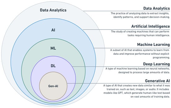 Figure 1 illustrates the relationship between different AI-related technologies, including data analytics, AI, ML, DL, and Gen-AI. Each layer in the diagram shows how these concepts fit together. These layers demonstrate the interconnection of these technologies, which all work together to provide advanced solutions for predicting and preventing injuries in sport [15].
