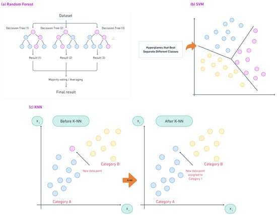 Basic architecture of ML models used in sports injury prediction: (a) RF; (b) SVM; (c) KNN.