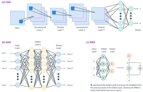 DL models excel at tasks involving large and complex datasets, offering the ability to automatically learn intricate patterns without the need for manual feature extraction [20]. These techniques are particularly useful in sports injury prediction when working with data from wearables, video analysis, or sequential performance metrics. DL methods such as convolutional neural networks (CNNs), artificial neural networks (ANNs), and recurrent neural networks (RNNs) provide powerful tools for identifying subtle injury risk factors and predicting potential injuries based on an athlete’s historical and real-time data. Below are the main DL techniques used in this area: