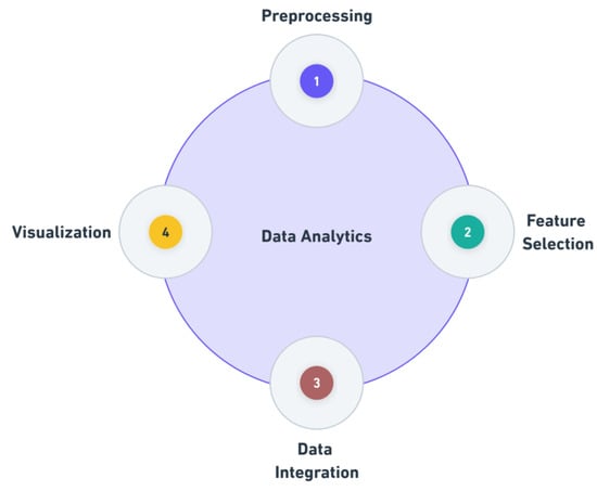 Data analytics is the foundation of AI applications in sports injury prediction, as illustrated in Figure 1. It involves collecting, cleaning, and interpreting data from multiple sources to make it usable for AI models [26]. The quality of the data analysis has a direct impact on the performance of AI systems, as accurate, well-structured data lead to better predictions. Figure 4 highlights the key steps in this process, which are essential for transforming raw data into a format suitable for AI-driven insights.