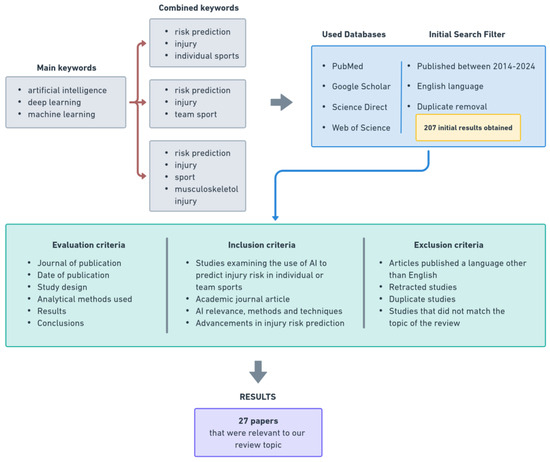 Our search was limited to articles published in English between 2014 and 2024 to ensure that we captured the most relevant and recent studies. In addition, we consulted publications specifically related to AI in sports injury risk prediction, resulting in the identification of over 207 relevant publications. After removing duplicate articles, we conducted a detailed evaluation of the remaining articles’ abstracts and titles to assess their suitability for inclusion in the review. We identified and included a subset of 27 studies that were directly relevant to our research. These selected studies provided valuable insights into the use and impact of AI in sport and formed the basis of our review.