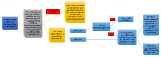 - Cui, J.; Zhao, K.; Sun, Y.; Wen, R.; Zhang, X.; Li, X.; Long, B. Diagnosis and treatment for the early stage of cytomegalovirus infection during hematopoietic stem cell transplantation. Front. Immunol. 2022, 13, 971156. [Google Scholar] [CrossRef]