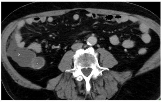 Ruptured mucocele of the appendix (a), with free mucin around the appendix (b) (CT, venous phase, axial plane).