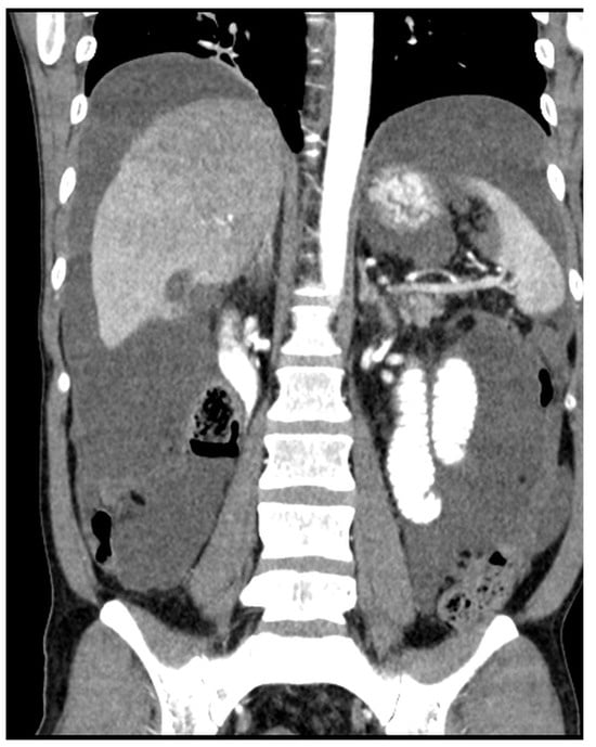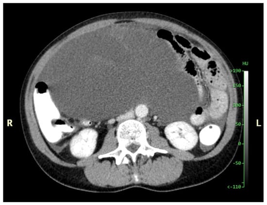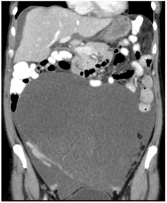 - Garg, P.; Garg, N.; Peer, S.; Chholak, D.; Kaur, M. Pseudomyxoma Peritonei Leading to “Jelly Belly” Abdomen: A Case Report and Review of the Literature. J. Med. Case Rep. 2024, 18, 296. [Google Scholar] [CrossRef] [PubMed]