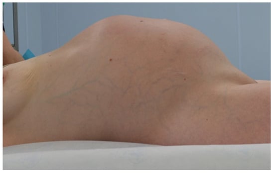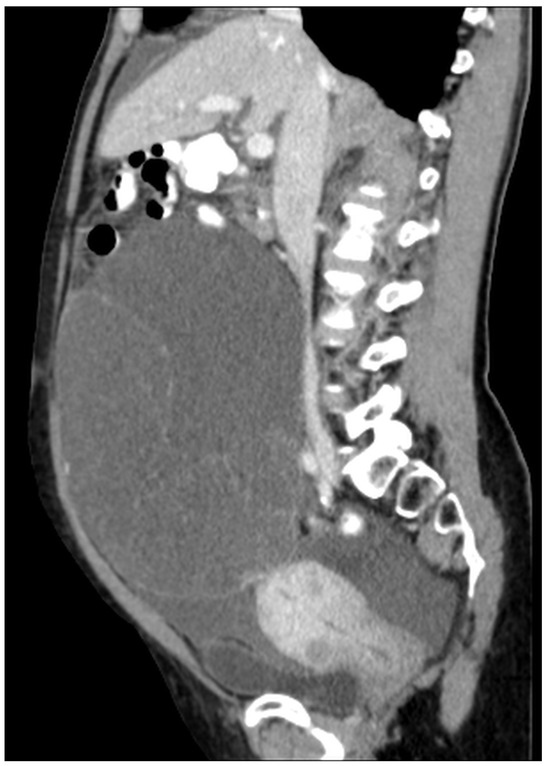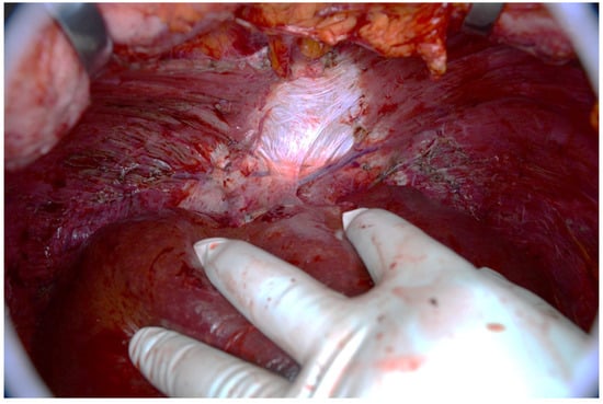 Patients with a misdiagnosed rupture of the mucocele may develop pseudomyxoma peritonei. It is characterized by the presence of an abundant gelatinous substance in the abdomen. Diffuse, progressive, and abundant mucin-containing tumor cells are typical of this disease [2] (Figure 11, Figure 12, Figure 13, Figure 14, Figure 15 and Figure 16). The interval between rupture and advanced disease is several years. In our clinical series, the interval was about 5 years. In the literature, we found a wide range of this interval from 12 months to 10 years [9,10]. The natural history of PMP revolves around the “redistribution phenomenon”, whereby mucinous tumor cells accumulate in the Douglas pouch, in the diaphragm (more on the right), and the small and large omentum (Figure 17). The small intestine is less involved [4]. Pseudomyxoma peritonei is a slowly progressing disease, which fills the peritoneal cavity over time. There are several classifications of pseudomyxoma. The most commonly used is the PSOGI classification [2]. Mucinous accumulation progresses to malnutrition, bowel obstruction, and respiratory compromise. Rarely, the tumor may spread to the pleural cavity. This has been described in 5.4% of cases. It may occur spontaneously or as a result of diaphragmatic injury during cytoreduction [8,11].