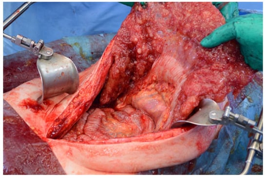 Treatment of the advanced disease consists of maximal cytoreduction (Figure 18 and Figure 19), which means the removal of all visible tumors and HIPEC. The abdominal cavity is lavaged with a warmed cytostatic solution at 42 degrees Celsius for 90 min. The most commonly used cytostatic is mitomycin. The clinical classification of pseudomyxoma peritonei is based on the Sugarbaker peritoneal cancer index, which can stratify the extent of the disease. The radicality of surgery is assessed according to the cytoreduction score [3,8,12].