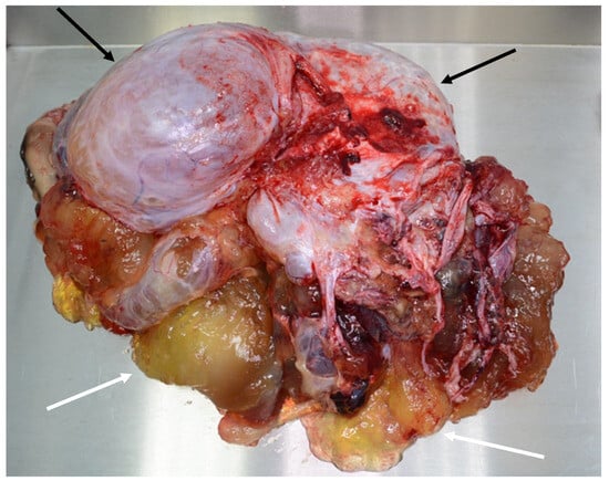 Specimen with tumor (black arrows) and mucin (white arrows).