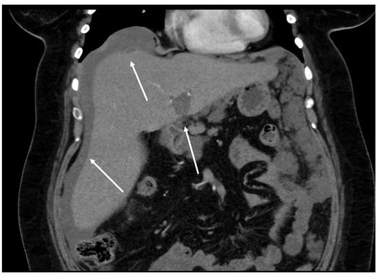 Recurrence four years after CRS + HIPEC. Mucinous tumor around the liver and in the porta hepatis (arrows). This patient was successfully treated with repeated CRS + HIPEC. (CT, portal phase, coronar plane).