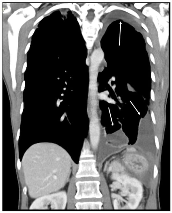 Recurrence of the pseudomyxoma peritonei in the abdominal and left thoracic cavities (arrows). The patient underwent two operations: first, CRS + HIPEC to address the intra-abdominal disease; then, CRS + HITHOC in the left thoracic cavity. The cause of the spread of the disease to the chest would probably be a thermal lesion of the diaphragm, which manifested sometime after the primary surgery. (CT, venous phase, coronar plane).