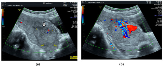 - Groszmann, Y.S.; Healy Murphy, A.L.; Benacerraf, B.R. Diagnosis and management of patients with enhanced myometrial vascularity associated with retained products of conception. Ultrasound Obstet. Gynecol. 2018, 52, 396–399. [Google Scholar] [CrossRef]