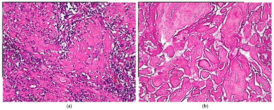 The histological images of the uterine biopsy show (a) decidua and fibroconjunctival fragments with structured and inflammatory necroses; (b) sclerohyalinized placental villi with structured necroses (HE × 20).
