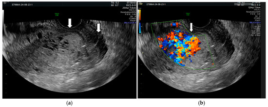 - Timmerman, D.; Van den Bosch, T.; Peeraer, K.; Debrouwere, E.; Van Schoubroeck, D.; Stockx, L.; Spitz, B. Vascular malformations in the uterus: Ultrasonographic diagnosis and conservative management. Eur. J. Obstet. Gynecol. Reprod. Biol. 2000, 92, 171–178. [Google Scholar] [CrossRef]