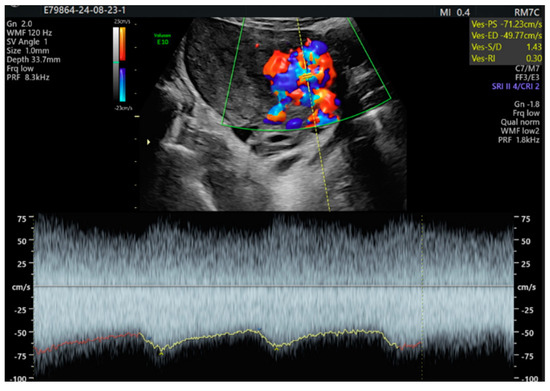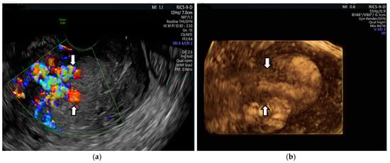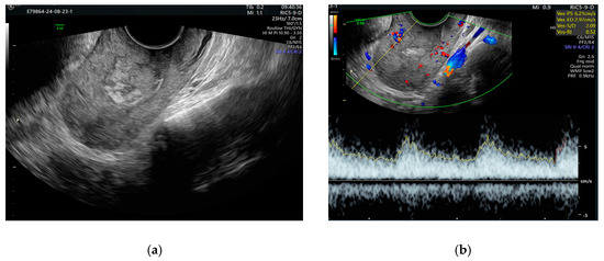 - Timmerman, D.; Wauters, J.; Van Calenbergh, S.; Van Schoubroeck, D.; Maleux, G.; Van Den Bosch, T.; Spitz, B. Color Doppler imaging is a valuable tool for the diagnosis and management of uterine vascular malformations. Ultrasound Obstet. Gynecol. 2003, 21, 570–577. [Google Scholar] [CrossRef]