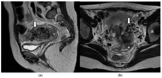 Dynamic magnetic resonance images of the pelvis. Arrows show numerous signal voids in the uterine wall: (a) longitudinal section; (b) transverse section.
