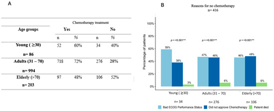 Chemotherapy treatment among metastatic patients. (A) describes the chemotherapy treatment among the groups of patients included. The highest prevalence of non-receipt of chemotherapy was among the young population. (B) describes the reasons for non-chemotherapy treatment. Bad ECOG (ECOG ≥ 3), was the main reason for non-eligibility for treatment in young patients. Statistical difference p < 0.005 (**).