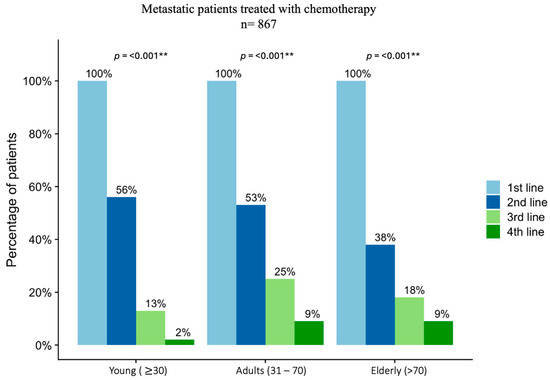 On the other hand, for the patients who received chemotherapy (n = 867), the lines of treatment diverged when they were compared between the groups, especially when considering reaching multiple lines of treatment as the third and fourth line. Specifically, only 13% (n = 7) and 2% (n = 1) of the young patients presented clinical eligibility criteria for these lines of systemic treatment. Moreover, 25% (n = 182) and 18% (n = 17) of the adults and elderly, respectively, received third-line chemotherapy, while 9% (n = 61; n = 9) received the fourth line of treatment in both groups (p <0.001) (Figure 2).