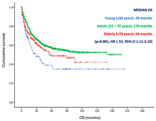 Overall survival of the global population according to age groups. Kaplan Meier curve that represent the differences in survival for the groups included, young (<30 years), adults (31–70 years), and elderly (>70 years). Young patients displayed a worse overall survival compared with adults and elderly patients. p <0.005.