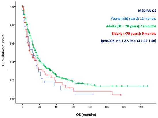 Overall survival of metastatic patients according to age groups. Kaplan Meier curve that represents the differences in survival for the groups included, young (<30 years), adults (31–70 years), and elderly (>70 years) in metastatic patients. Elderly and young patients displayed a worse overall survival compared with adult patients. p <0.005.