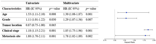 According to the overall survival analysis, the median OS for young patients was 29 months, compared to 170 months for adults, and 56 months for the elderly group of patients (p <0.001, HR 1.53, 95% CI 1.11–2.10) (Figure 3). Subsequently, a sub-analysis was performed by selecting patients with metastatic disease. In this analysis, we observed that the adult patients had a higher median OS (17 months) versus the young and elderly patients (12 months and 9 months) (p = 0.008, HR 1.27, 95% CI 1.02–1.46) (Figure 4). Furthermore, according to the univariate analysis, the age (HR: 1.53; p: 0.008), grade (HR: 1.11; p: 0.030), clinical stage (HR: 1.18; p: 0.001), and metastasis site (HR: 1.88; p: 0.001) were statistically significant. Additionally, when performing the multivariate analysis, only age (HR: 1.30; p: 0.001), grade (HR: 1.29; p: 0.007), clinical stage (HR: 1.85; p: 0.001), and metastasis site (HR: 1.78; p: 0.002) remained as independent predictors for OS (Figure 5). Therefore, age remains a significant predictor of overall survival, as well as grade, clinical stage, and metastasis site.