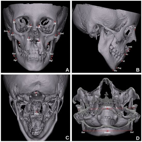 - Parveen, S.; Husain, A.; Johns, G.; Mascarenhas, R.; Reddy, S.G. Three-Dimensional Analysis of Craniofacial Structures of Individuals With Nonsyndromic Unilateral Complete Cleft Lip and Palate. J. Craniofac. Surg. 2021, 32, e65–e69. [Google Scholar] [CrossRef]