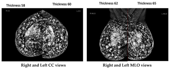 Breast thickness can vary significantly between different mammographic views, even within a single patient (Figure 2). This variability highlights the importance of tailoring imaging protocols to account for individual anatomical differences. Customizing these protocols ensures that radiation dose is optimized while maintaining image quality. It is crucial to recognize that the immediate risk associated with a single screening may decrease as one ages; however, cumulative radiation exposure from multiple screenings can still result in substantial health risks over time. Accumulated doses could increase the likelihood of radiation overexposure. The relationship between increased screening frequency and improved detection rates is not always linear. There is a higher potential for overdiagnosis and overtreatment of slow-growing or clinically insignificant cancers among older women, which may lead to unnecessary interventions without a proportional survival benefit, ultimately impacting their overall health and quality of life. As an additional point of interest, the fact that MGD varies across different breast thicknesses underscores the requirement of developing personalized imaging protocols. It is possible to further optimize dosage levels while retaining diagnostic accuracy by implementing automated exposure control systems that modify settings based on the features of each individual breast.