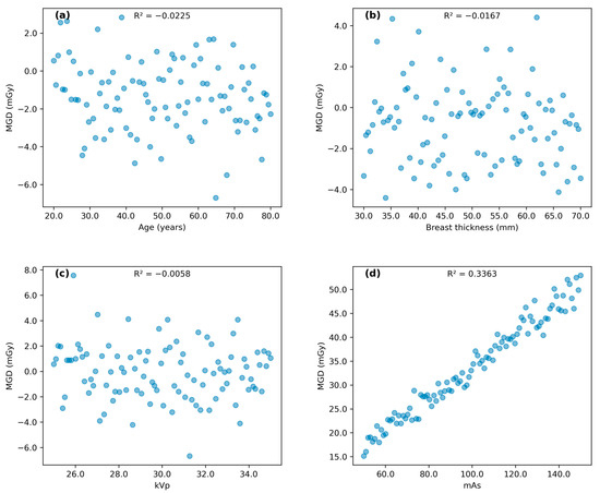 Scatter plots illustrating correlation pattern between (a) subject’s age, (b) breast thickness, (c) kVp, and (d) mAs with MGD for CC view.