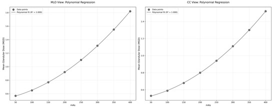 Polynomial regression analysis of the relationship between mAs and mean glandular dose (MGD) for MLO and CC views.