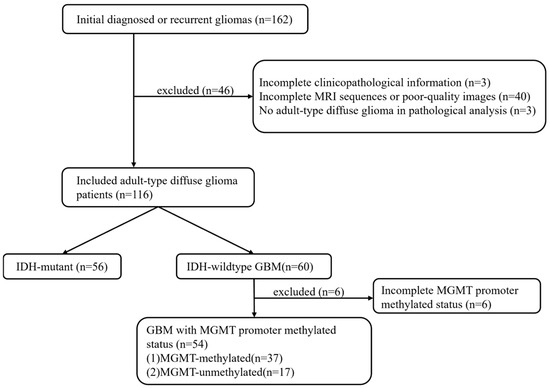 Between February 2019 and June 2024, 162 adult patients who underwent an MRI brain scan within one week before biopsy or surgical resection with initial or recurrent gliomas, confirmed by pathological examination of our institution, were included in this retrospective analysis study. Figure 1 shows the patient enrolment process. There were 46 cases excluded because of incomplete clinicopathological information (n = 3), incomplete MRI sequences, or poor-quality images (n = 40), or no adult-type diffuse glioma in the pathology (n = 3). A final total of 116 patients with adult-type gliomas (mean age 51.5, range 19–89 years; 61 males, 55 females) were enrolled for this study. According to the IDH genotypes and the MGMT promoter status, patients were initially categorised into the IDH-wildtype group (n = 60) and the IDH-mutant group (n = 56). Then, the patients in the IDH-wildtype group (n = 54, due to 6 patients whose MGMT methylation status information was missing) were divided into the MGMT-methylated subgroup (n = 37) and the MGMT-unmethylated subgroup (n = 17). For this retrospective investigation, the Xuanwu Hospital Medical Ethics Committee authorised the subjects’ informed consent exemption ([2023]044).