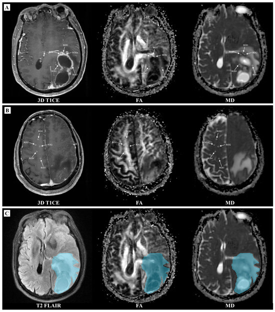The GE AW 4.7 workstation calculated FA and MD maps based on DTI. Then, FLAIR images, FA and MD maps were registered to T1CE images for subsequent analyses using SlicerANTs extension in 3D slicer (v5.4.0, https://www.slicer.org accessed on 28 September 2024). Five ROIs were manually delineated on the solid part of each lesion, avoiding overlap and excluding necrotic, haemorrhagic and cystic zones, to calculate FA and MD maps and the tumour-to-normal tissue values ratio. Each ROI was sized between 20 and 40 mm2, with an additional five ROIs placed on the contralateral frontal part of the centrum semiovale, consistent with previous studies [25]. For FA and MD metrics, we calculated the average value for minimum, maximum, mean, and median value in each ROI, representing them as FAmin, FAmean, FAmedian and FAmax (for Fractional Anisotropy), MDmin, MDmean, MDmedian and MDmax, (for Mean Diffusivity). The relative FA (rFA) and relative MD (rMD) for minimum, mean, median and maximum were calculated by dividing the tumour FA and MD value by those of the centrum semiovale, as shown in Figure 2A,B.