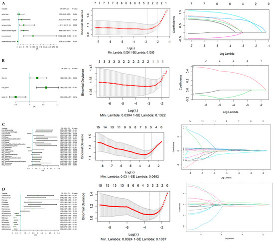 Forest plot of univariate logistic regression and the results of LASSO regression for different modalities MRI. (A) Conventional MRI results. (B) 1H-MRS results. (C) DIT histogram results. (D) Conventional DTI results.