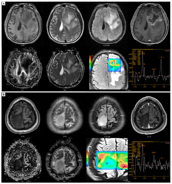 The following supporting information can be downloaded at https://www.mdpi.com/article/10.3390/diagnostics14222569/s1, Table S1: Conventional MRI scan parameters; Table S2: Features differences from mono-modal MRI between IDH-mutant group and IDH-wildtype group; Table S3: Logistic regression results for prediction IDH status based on features from mono-modal MRI model; Table S4: Features differences from mono-modal MRI between MGMT-methylated group and MGMT-unmethylated group; Figure S1: The ROI selection in the multi-voxel 2D MRSI spectra for cases in the IDH-wildtype group and IDH-mutant group; Figure S2: The ROI selection in the multi-voxel 2D MRSI spectra for cases in the MGMT-methylated group and MGMT-unmethylated group.