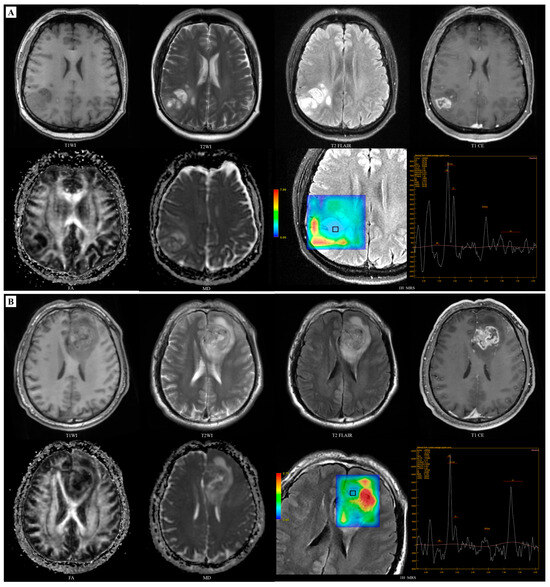 Multimodal MRI of MGMT-methylated and MGMT-unmethylated IDH-wildtype GBM cases. (A) A 54-year-old female patient, IDH-wildtype with MGMT methylated: the mass located in the right parietal lobe with long T1 and long T2 signals. The tumour parenchyma show obvious-heterogeneous enhancement, with peritumoral oedema and necrosis, with FA-Median = 0.215. 1H-MRS analysis (voxel size = 1.3 cm × 1.3 cm × 2.0 cm) showed the level of NAA/Cr is 0.674. (B) A 50-year-old male patient, IDH-wildtype with MGMT unmethylated: the mass located in the left frontal lobe with circular long T1 and long T2 signals and obvious heterogeneous enhancement on enhanced scans like the previous case, with the presence of peritumoral oedema and necrosis, with FA-Median = 0.176. 1H-MRS analysis (voxel size = 1.3 cm × 1.3 cm × 2.0 cm) showed the level of NAA/Cr is 0.401.