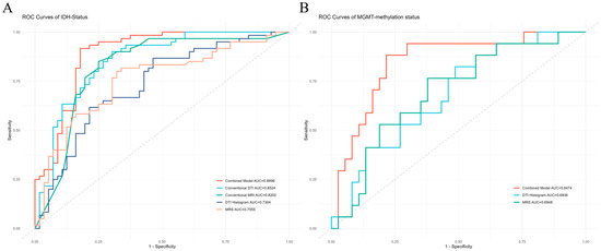 Adult-type diffuse gliomas comprise most primary malignant brain tumours, which include IDH mutants without 1p/19q non-codeleted astrocytoma, IDH mutants with 1p/19q codeleted oligodendroglioma, and IDH-wildtype glioblastoma according to the 2021 WHO classification of central nervous system tumours [1,2]. The IDH mutation is essential for prognostic risk stratification and evaluating treatment response in patients with adult-type diffuse gliomas, correlating with improved overall survival and treatment response relative to IDH-wildtype gliomas [3]. Treatment strategies tailored to distinct molecular subtypes have been shown to enhance patient survival by approximately 17.2 months [4,5]. Furthermore, IDH-wildtype GBM with methylated MGMT has greater sensitivity to temozolomide chemotherapy than those with unmethylated MGMT, which can prolong the survival time of IDH-wildtype GBM by 7.2–8.9 months [6,7]. Histological specimens acquired through resection or biopsy are the current standard method for genotyping and are invasive and time-consuming. Furthermore, the biopsy pathology may be disturbed by intratumor heterogeneity [8,9].