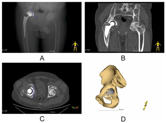 Representative imaging results (X-ray and CT scan) (Patient No. 6) with marked pelvic BRIM defect (blue line) (A,C); (A) X-ray image before revision surgery; (B) coronal plane image of CT scan before revision surgery; (C) axial plane image of CT scan before revision surgery; (D) segmented pelvic bone with visible structural discontinuity of the iliopectineal line (pelvic BRIM).