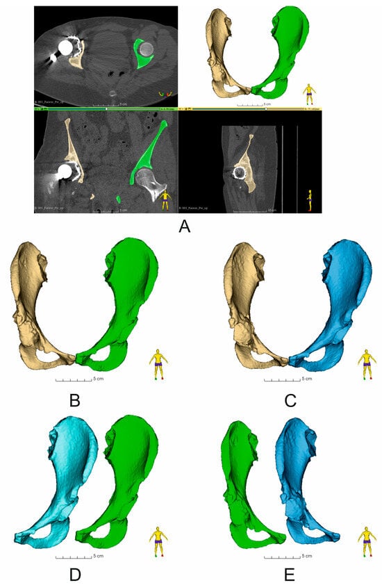Assessment of bone structure segmentation and comparison of the volume of segmented bone structures within the operated pelvis (Patient No. 7): (A) Image of segmented pelvic bones (yellow—damaged side of the pelvis, green—undamaged side of the pelvis) obtained on the basis of CT image analysis. View in the following planes: axial, coronal, and sagittal; (B) comparison of the volume of undamaged (yellow) and damaged (green) pelvic bones before revision surgery; (C) comparison of the volume of undamaged (yellow) and damaged (blue) pelvic bones after revision surgery; (D) comparison of the volume of undamaged sides of the pelvic bone: blue—undamaged pelvic bone after revision surgery, green—undamaged pelvic bone before revision surgery; (E) comparison of the volume of damaged sides of the pelvic bone: blue color—damaged pelvic bone after revision surgery, green color—damaged pelvic bone before revision surgery. The numerical data are shown in Table 2.