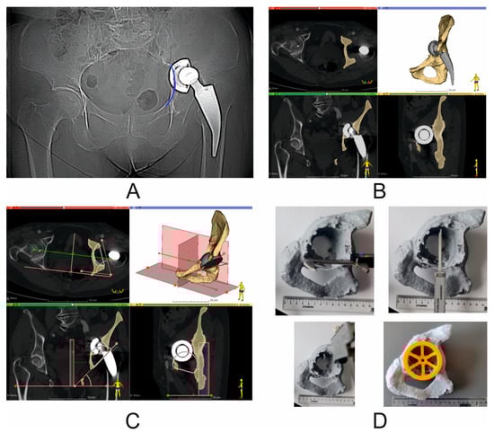 Virtual COR and pelvic BRIM reconstruction, based on the assumed inclination angle and anteversion angle according to the Lewinnek safe zone, and taking into account the smallest possible bone loss. (A) X-ray image (Patient No. 2)—blue color—marked discontinuity of pelvic BRIM; (B) preoperative CT scan (Patient No. 2). View in the following planes: axial, coronal, and sagittal; segmented bony structures of the pelvis; yellow color—damaged pelvis with bony defect of the anterior column and pubic bone and visible damage to pelvic BRIM; gray color—primary acetabulum and stem with head; (C) virtual surgical planning—virtual reconstruction of the COR and pelvic BRIM based on the assumed inclination angle and anteversion angle according to the Lewinnek safe zone; yellow color—simplified representation of a 68 mm diameter revision cup; (D) photo of a printed model of a damaged pelvis showing the way of measuring the distance between the most important support points for the revision cup. This is characteristic for preoperative planning measurement between the pubic bone and the ischium, and between the acetabular notch and the roof. For the oversizing technique, the quotient is close to 1 (i.e., the ratio of horizontal axis defect distance to vertical axis defect distance in the sagittal plane). Verification of the cup diameter selection using the printed cup gauge—diameter 68 mm (Patient No. 6).