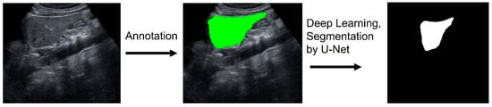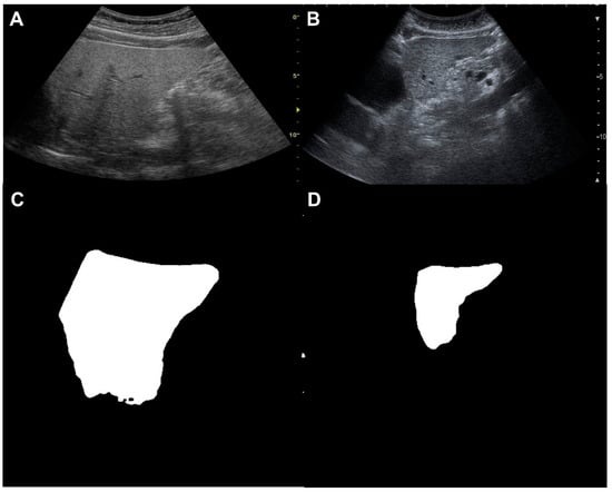 Out of the 486 images, 214 were manually annotated by outlining the liver’s contours by an experienced ultrasound specialist (N.M), starting from the earliest in the shooting sequence. In cases where the screen’s edge obscured the head side of the liver, those edge lines were included as part of the liver’s contour. A black box was added to the image so that the short width of the image would equal the long width, and all images were unified to be square. Initially, the U-Net model was employed for liver segmentation, using 477 cases for training [30] (Figure 1, Figure 2, Figure 3 and Figure 4).