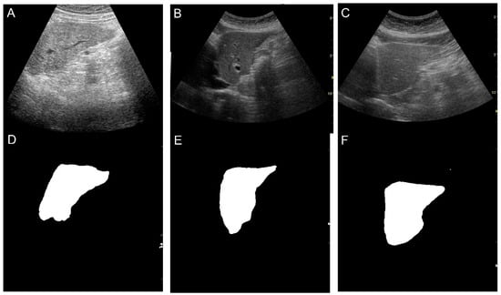 Represented cases of segmentation of the left liver lobe. (A–C) are original B-mode images. (D–F) are generated with segmentation by AI.
