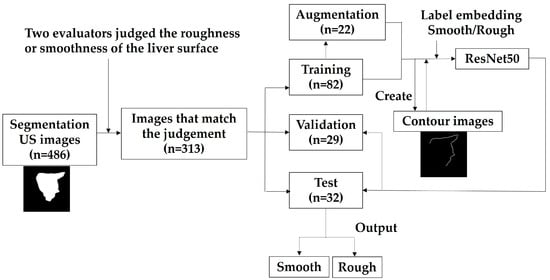 We propose a method to classify the roughness or smoothness of the liver surface using segmentation images generated by U-Net. For classification, we employed ResNet-50. Since the segmentation images contain information unrelated to liver fibrosis, we created images that only included the contours of the rear and front sides of the liver from the segmentation images (Figure 5). Due to the small number of images with a rough liver surface, affine transformations were applied to these images without scaling change for augmentation of the number of images. Affine transformations were performed with ±10 degree rotations and translations of 10% of the total number of pixels in the entire image for images depicting roughness. The dataset included 102 images for training, 29 for validation, and 32 for testing. Details of the dataset are shown in Table 3. We used Focal Loss [31] as the loss function, as it is robust to unbalanced datasets. The evaluation metrics included the number of images classified as rough or smooth, as well as the overall accuracy.