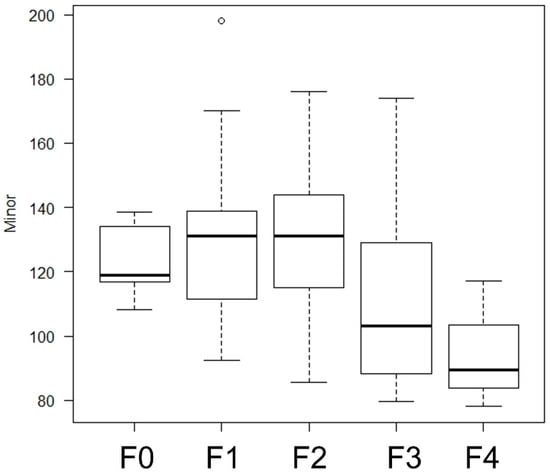 MinFeret and Minor inversely correlated with liver fibrosis stage (p = 0.046 and 0.036, respectively). The circle in F1 meant a maximum value at the box plot.