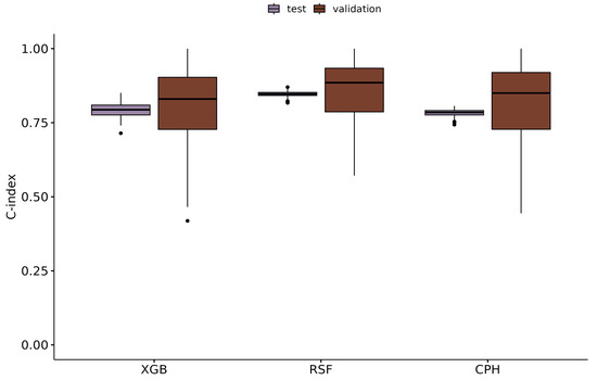 Performance: boxplots to visualize the performance of the applied models during validation and when predicting the outcome in the independent holdout test dataset. The underlying data for each boxplot are the performance of the 100 models from the repeated CV during validation and when applying these 100 models to predict the outcome in the holdout test dataset. XGB: xgboost; RSF: random survival forest; CPH: Cox proportional hazards regression.