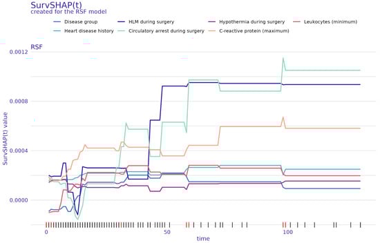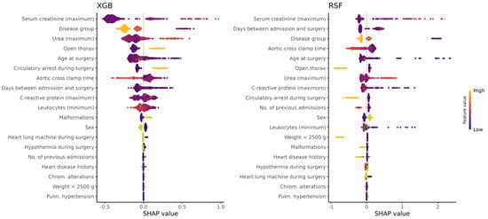 In our study, the union set of the five most important features of the two applied ML methods XGB and RSF according to SHAP comprises the data elements age at surgery, aortic cross-clamp time, days between admission and surgery, disease group, open thorax, serum creatinine (maximum), and urea (maximum). The days between admission and surgery could reflect a worse preoperative status or admission in a decompensated cardiovascular state with the need for recovery, but this is speculative, as we did not further investigate the reason for the delayed time to surgery. The importance of preoperative status in predicting mortality was also emphasized by Bertsimas et al. in their large database study [8]. A short time (12 days) since last admission and any common preoperative risk factor (i.e., shock, sepsis, mechanical ventilator) were associated with worse outcomes [8]. Consistent with previous studies using machine learning models for risk prediction, aortic cross-clamp or bypass time is a significant and meaningful risk factor [44,52,53]. Assessment of inflammatory state as an expression of the individual response to perioperative and postoperative factors (such as prolonged CPB) and complications demonstrated a correlation between lower postoperative leukocyte minimums and higher risk of mortality, as identified by SHAP and SurvSHAP(t) (Figure 2 and Figure 3). This laboratory value could serve as a surrogate parameter for a pronounced or abnormal inflammatory response to surgery and CPB. Systemic inflammatory response syndrome (SIRS) is common after cardiac surgery, with a rate of 20 to 32.5% [54,55] and is related to increased mortality [56]. Most commonly, however, SIRS is associated with an elevated white blood cell count [56]. We did not measure SIRS in our setting because it is difficult to accurately define and measure SIRS in the neonatal and pediatric postoperative course [57], and it ideally needs to be established prospectively. Therefore, it cannot be concluded whether this result might be related to an increased SIRS reaction.