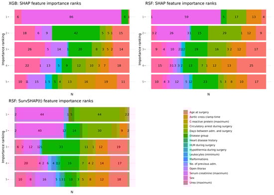 To provide more insights on the feature importance variability among the repeated CV models of each ML method, Figure 4 visualizes the number of CV models in which a certain feature occurred within the five most important features according to SHAP for XGB (top left) and RSF (top right), as well as for RSF according to SurvSHAP(t) (bottom left). This visualization shows that the maximum values of serum creatinine observed within 72 h post-surgery was ranked according to SHAP the most important feature in 86% of all XGB models and in 59% of all RSF models. Likewise, serum creatinine was also ranked as the most important feature according to SurvSHAP(t) in 44% of all repeated CV models, which was on par with the days between admission and surgery (Figure 4). Similar to SHAP, the disease group, age at surgery, and open thorax, but also the post-surgery minimum values of leukocytes and the maximum values of urea, were ranked amongst the five most important features in many of the repeated CV models when computing SurvSHAP(t) values.
