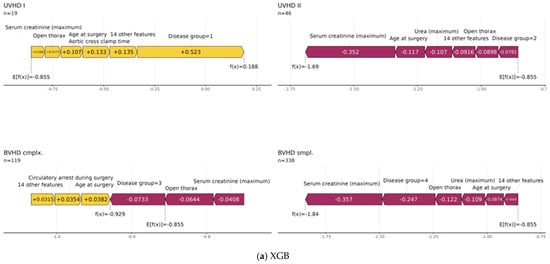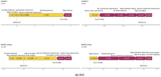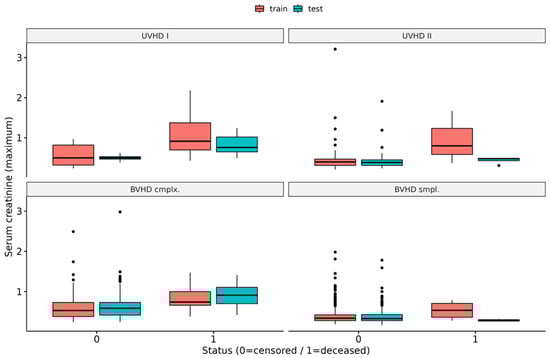 Furthermore, force plots of the aggregated global SHAP values as shown in Figure 5 for XGB and RSF are a visualization to provide more insights into the underlying data structure. Using these plots, it can be visualized how the specific observations’ feature values in the independent holdout test dataset influenced the models’ predictions stratified by the four disease groups. It is noteworthy that, according to the RSF force plots, the maximum values of serum creatinine noticeably seemed to increase the mortality risk on average for the disease groups UVHD I and BVHD cmplx., whereas a negative effect of this variable was observed in the two other groups. The XGB force plots instead show an increased mortality risk of higher post-surgery maximum values of serum creatinine only for UVHD I cases, whereas in all other disease groups higher levels were associated with decreased mortality risk. Furthermore, it can be seen that the central tendency of the serum creatinine values is similar between the training dataset and the test dataset for the censored cases in all four disease groups. In contrast, the deceased cases in the CHD groups UVHD II and BVHD smpl. in the test dataset exhibited noticeably lower maximum values of serum creatinine than the corresponding training dataset (see Figure 6). Nevertheless, Figure 5 also reveals that inclusion in the disease group UVHD I was identified as the most important factor for increased mortality risk by both ML methods (Figure 5).