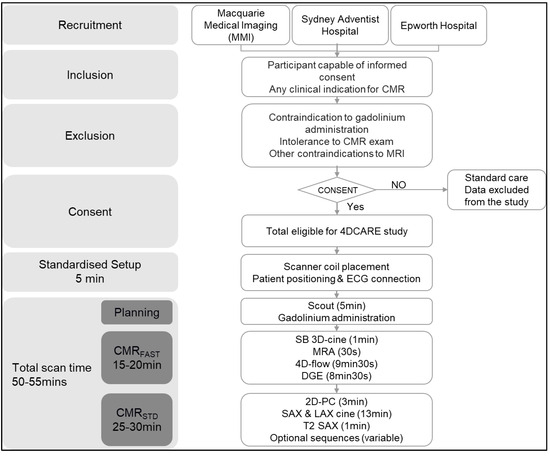 The 4DCarE study recruitment began in August 2017 and is ongoing. The flow chart for the study is presented in Figure 1. The recruitment target is 1200 participants. Participants were individuals referred for a cardiac MRI for any clinical indication who were able to provide informed consent. Participant eligibility was assessed by the central study coordinator at the time of protocolisation and consent was obtained prior to imaging acquisition. Inclusion criteria for CMR were any participants referred by a health professional for CMR at the participating study sites who were capable of and willing to give informed consent. Exclusion criteria were participants with contraindications to gadolinium contrast, those who were unable to tolerate the complete exam, and any other contraindication to MRI.
