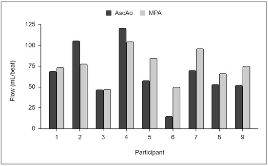 Flow measurements from nine poor-quality 4D-flow series showing discordant flows between the ascending aorta (AscAo) and main pulmonary artery (MPA).