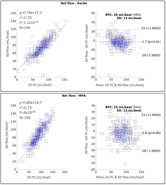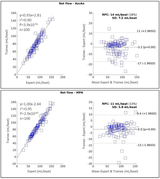 Figure 5 shows the correlation and Bland–Altman plots for net flow measured in the AscAo and MPA using 2D-PC to compare a trained annotator with a CMR expert. For measurements in AscAo, the trained annotator’s performance was rated good (ICC 0.93 [95% CI 0.90–0.95], = 0.90, MD = −3.2 7.2 mL/beat, p < 0.05, RPC = 14 mL/beat). In the MPA, the trained annotator’s performance was excellent, (ICC 0.97 [95% CI 0.96–0.98], = 0.95, MD = −2.0 5.8 mL/beat, p < 0.05, RPC = 11 mL/beat).